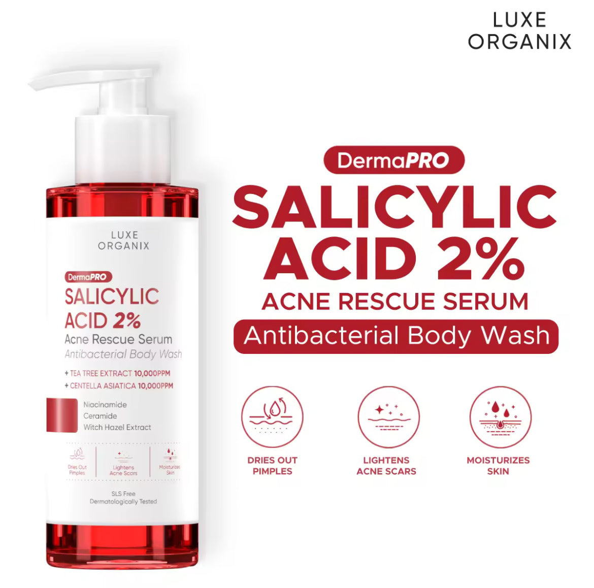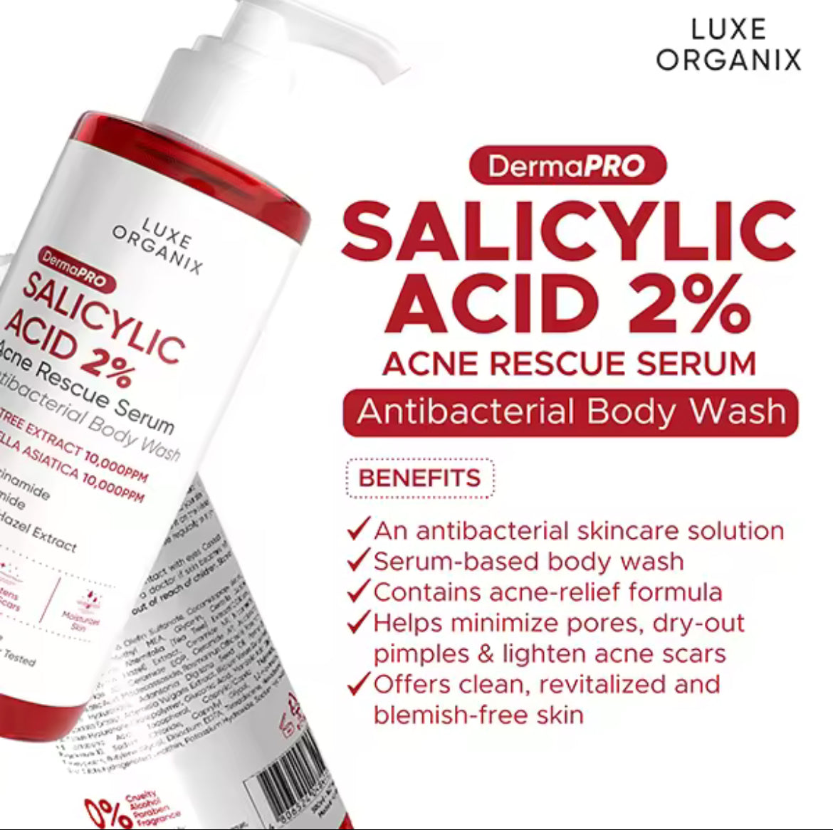 ON HAND! Luxe Organix Dermapro Salicylic Acid 2% Acne Rescue Serum Antibacterial Body Wash 500ml