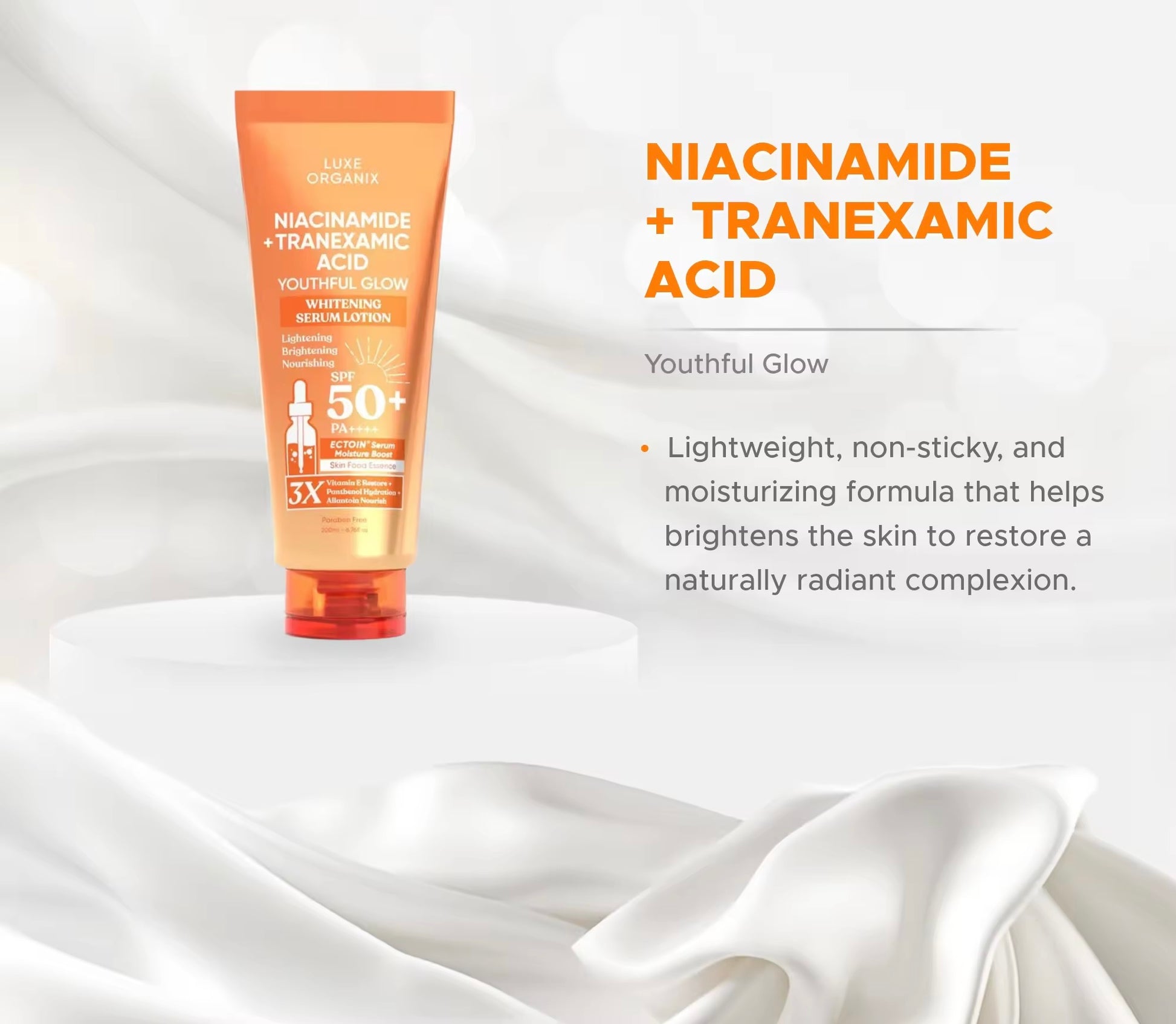 ON HAND! LUXE ORGANIX NIACINAMIDE + TRANEXAMIC ACID YOUTHFUL GLOW WHITENING SERUM LOTION SPF 50 PA++++