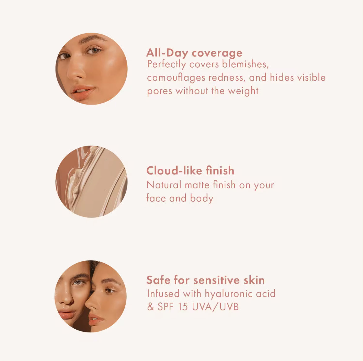 • Perfectly covers blemishes, camouflages redness, and hides visible pores without the weight